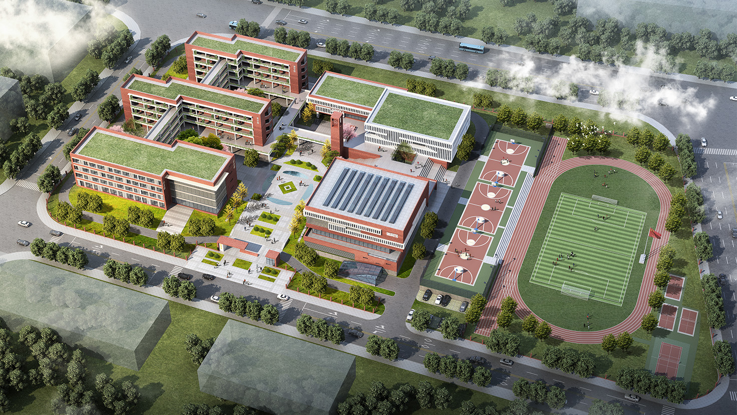 項(xiàng)目規(guī)模:看云中學(xué)規(guī)劃為教學(xué)辦公區(qū)、中央景觀廣場(chǎng)區(qū)、生活運(yùn)動(dòng)區(qū)三大部分,各組建筑通過(guò)連廊和架空平臺(tái)聯(lián)系在一起,形體柔美,大氣,自然圍合成形態(tài)各異的院落空間,柔和的界面,精巧而又不失特色的的建筑造型,傳統(tǒng)與現(xiàn)代完美融合,處處吸引著有著無(wú)限求知欲望的孩子們。